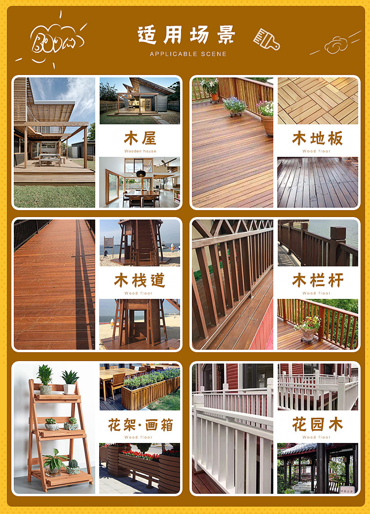 防腐木就是將木材經(jīng)過添加防腐劑之后,使其具有防腐蝕、防潮,防真菌,防蟲蟻、防霉變等特性,能夠直接接觸土壤及潮濕環(huán)境,經(jīng)常使用在戶外地板,工程,景觀,防腐木花架等,供人們歇息和欣賞自然美景,是戶外地板、園林景觀、木秋千,娛樂設(shè)施,木棧道等理想材料。